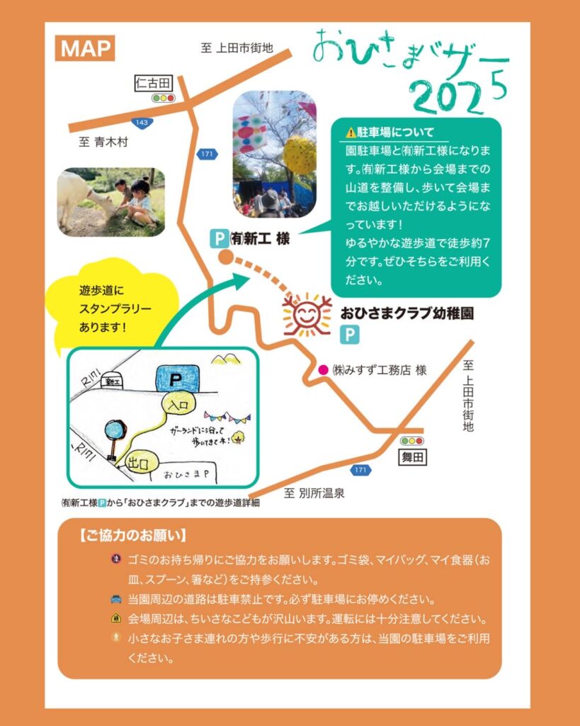 今年は(有)新工様から会場までの山道を整備したので、歩いて会場までお越しいただけるようになりました!!