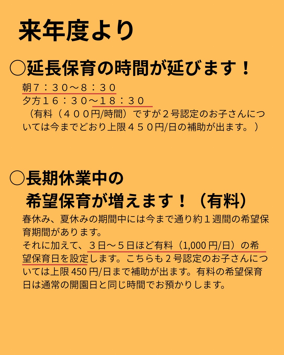 【お知らせ】2026年度から、延長保育時間と、長期休業中の預かり保育日が増えます
